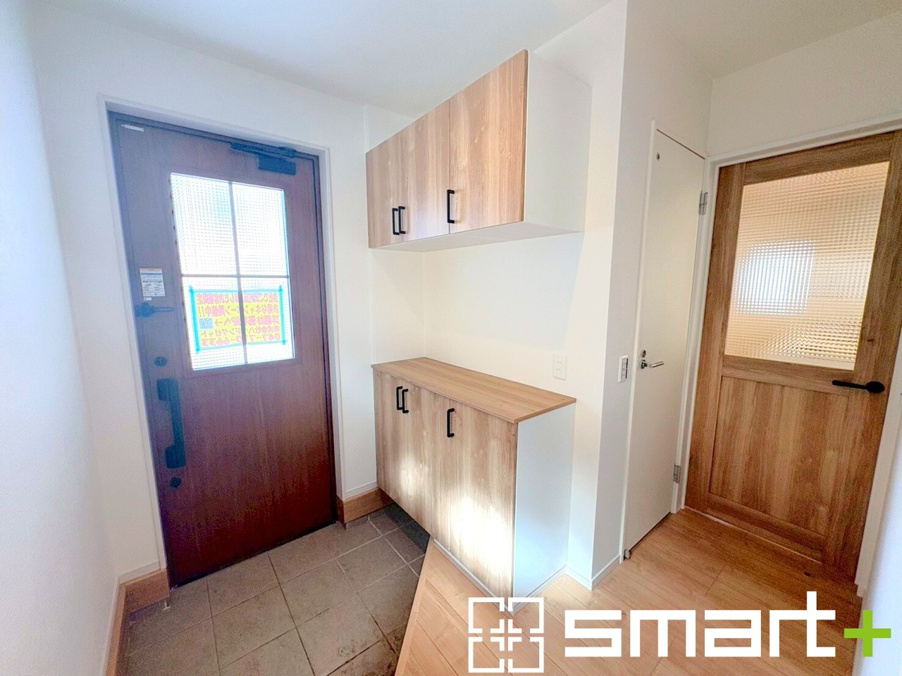 2号棟 ~ナチュラルカラーの玄関~ ・優しいナチュラルカラーで纏められた玄関は圧迫感もなく広々とした印象に。 ・玄関ドアにガラス部分を設ける事で穏やかな陽の入る玄関になります。