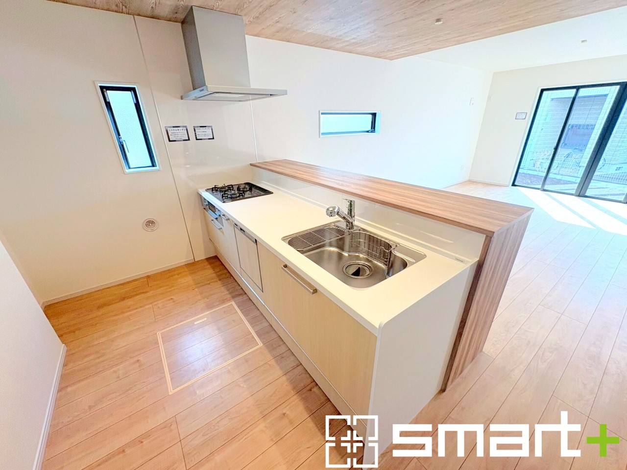 2号棟 ~人気のカウンターキッチン~ ・キッチンには余計な柱が無いので、リビングが見渡せ開放感のある造りとなっております。 ・蛇口には浄水器が内蔵されるなど機能面でも優れたキッチンです。