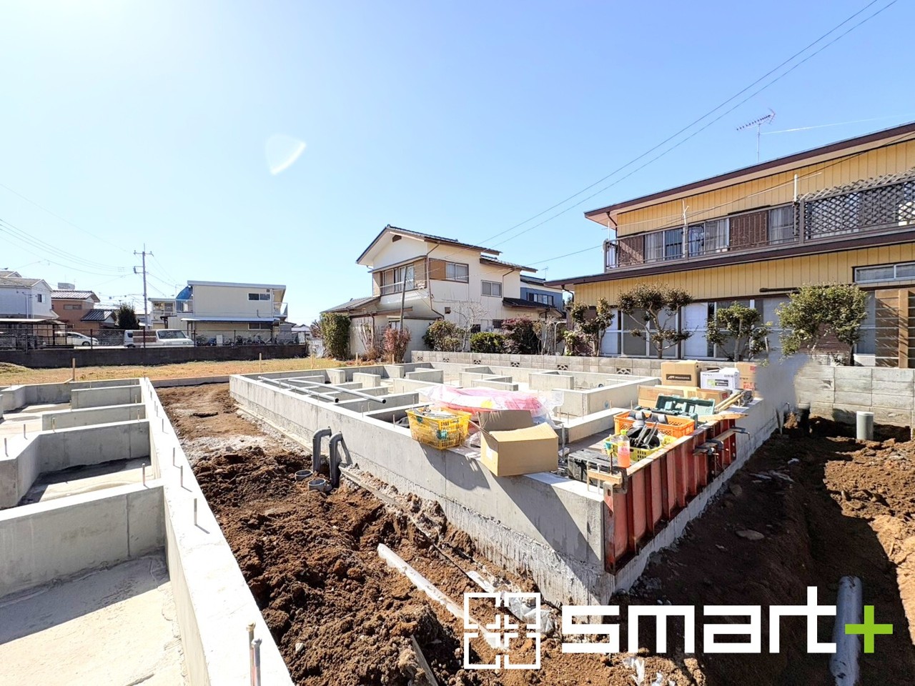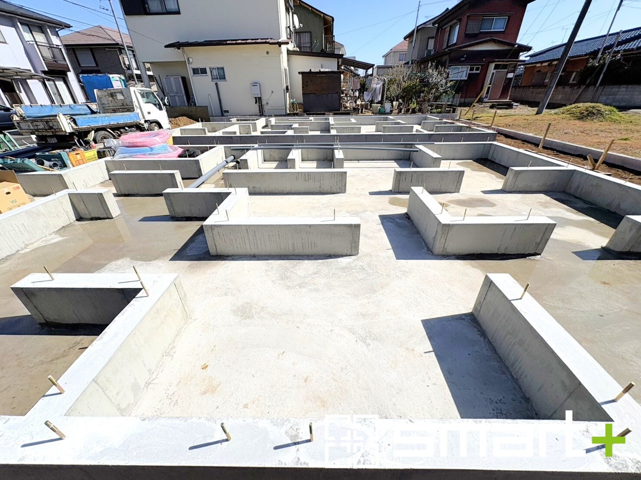 A号棟 ~ベタ基礎でしっかりとした土台~ ・コンクリートの中に鉄筋を配し強度を高めた「ベタ基礎」を採用。 ・しっかりとした土台を造ったうえで、その上に建物が築造されていきます。