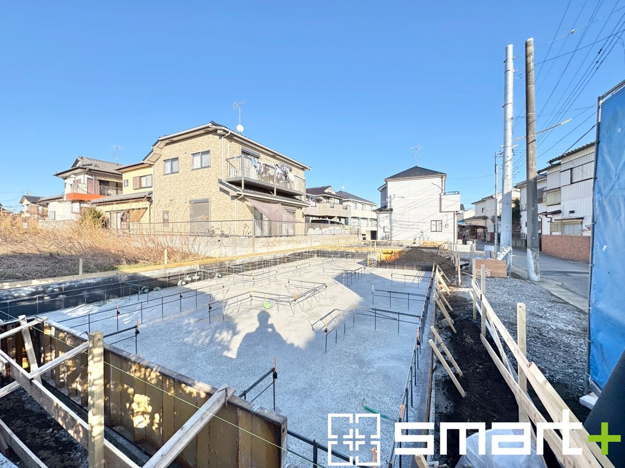 B号棟 ~ベタ基礎でしっかりとした土台~ ・コンクリートの中に鉄筋を配し強度を高めた「ベタ基礎」を採用。 ・しっかりとした土台を造ったうえで、その上に建物が築造されていきます。
