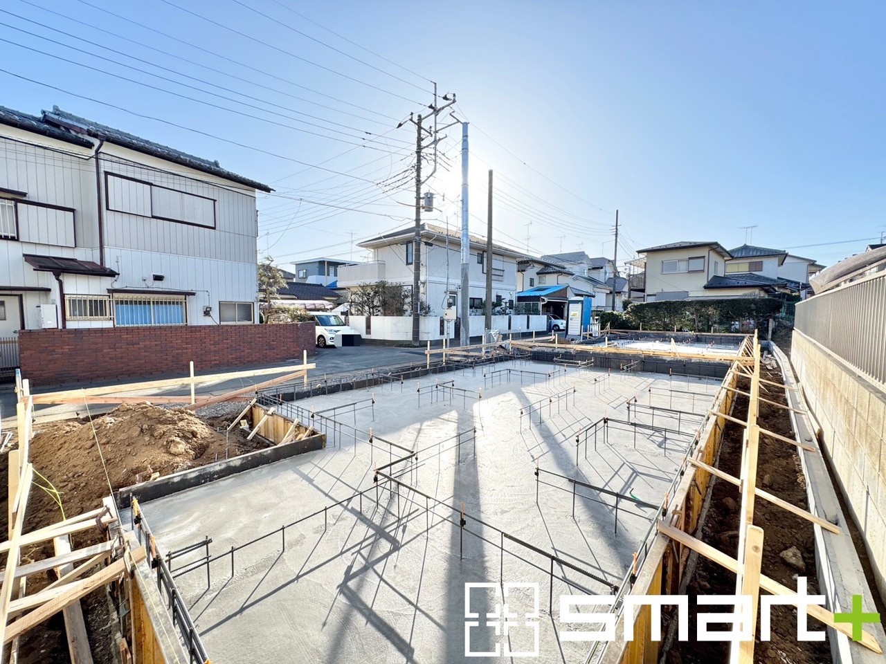 ~ベタ基礎でしっかりとした土台~ ・コンクリートの中に鉄筋を配し強度を高めた「ベタ基礎」を採用。 ・しっかりとした土台を造ったうえで、その上に建物が築造されていきます。 (A号棟)