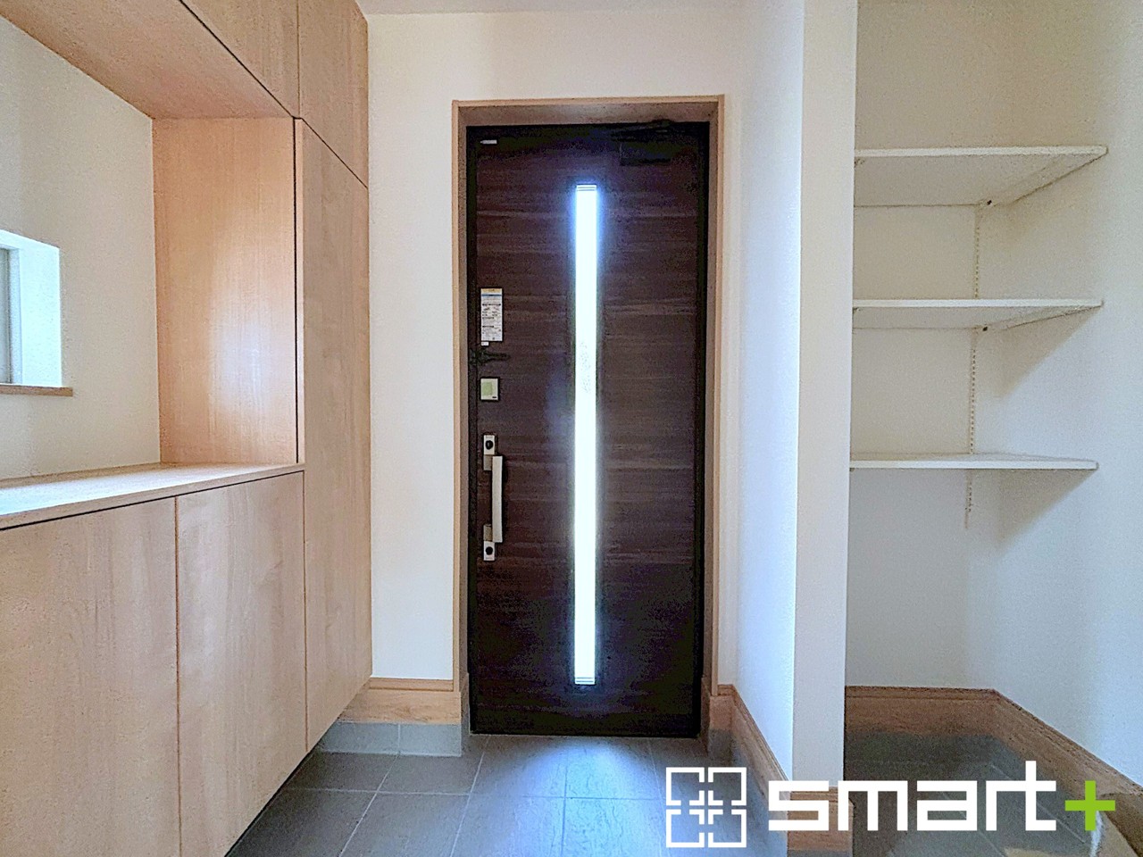 ~圧迫感のない明るい玄関~ ・窓に加えて玄関ドアのガラス部分からも穏やかな陽が入り、明るい玄関になります。 ・備え付けのシューズボックスはたっぷりしまえて玄関がスッキリ片付きますね。
