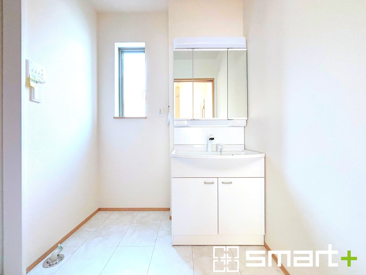 ~明るい洗面スペース~ ・窓から明るい陽が入り、気持ちよく朝の支度ができますね。 ・使い勝手の良い三面鏡タイプのシャワー付き洗面化粧台。鏡の裏に収納があるので洗面台周りもスッキリ。