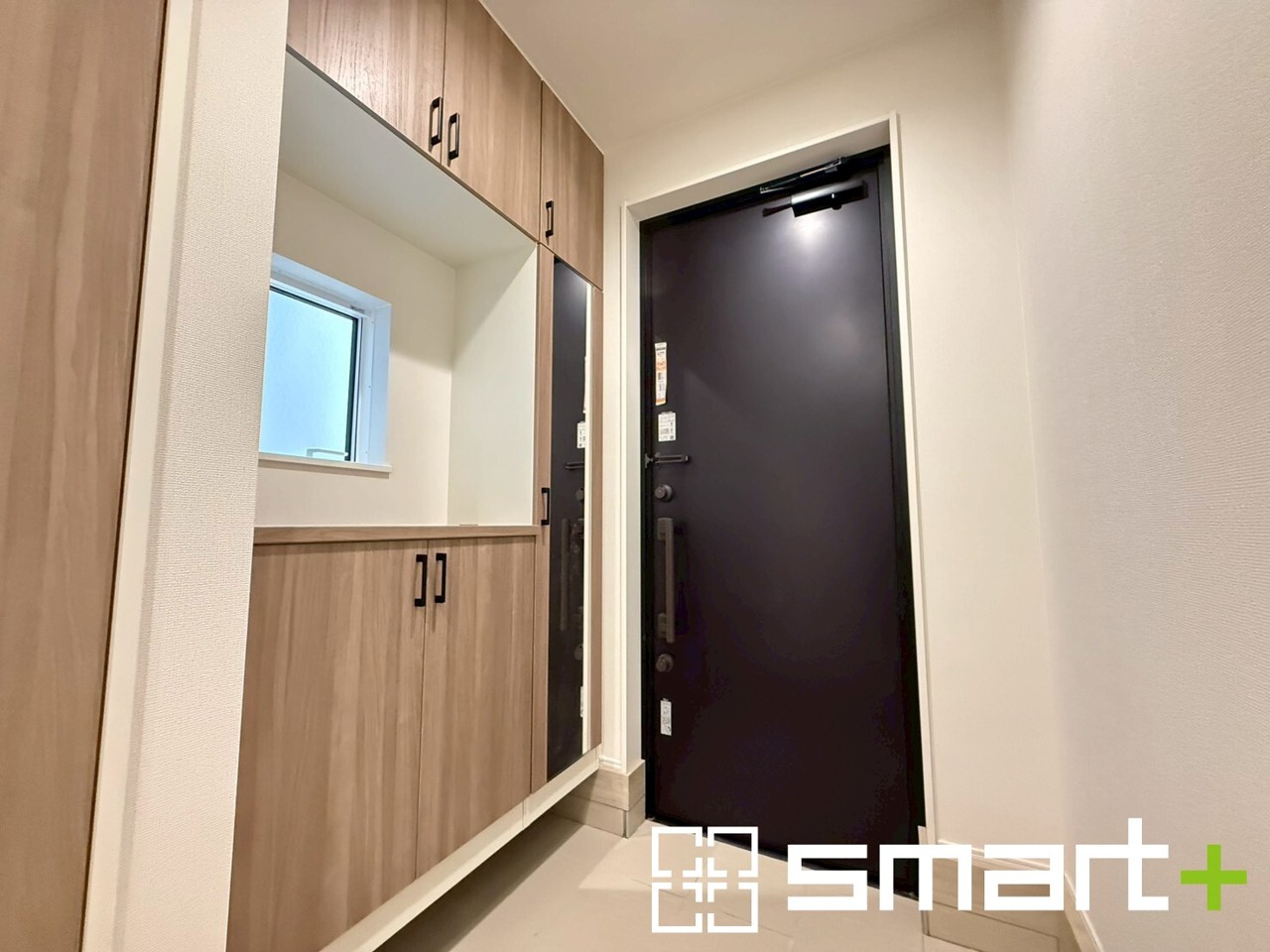 ~圧迫感のない明るい玄関~ ・窓に加えて玄関ドアのガラス部分からも穏やかな陽が入り、明るい玄関になります。 ・備え付けのシューズボックスはミラー付なのでお出かけ前のチェックに大活躍。
