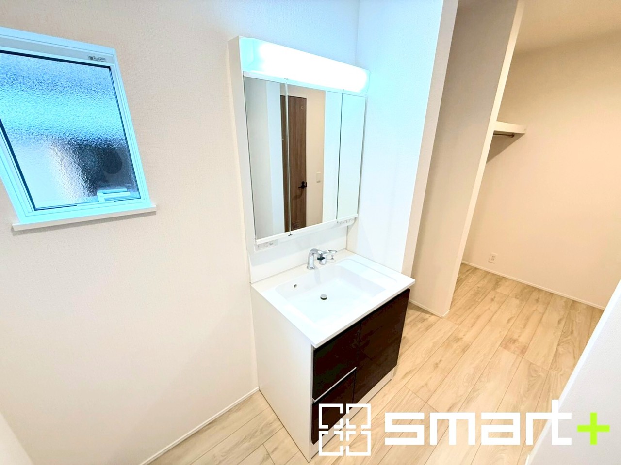~明るい洗面スペース~ ・窓から明るい陽が入り、気持ちよく朝の支度ができますね。 ・使い勝手の良い三面鏡タイプのシャワー付き洗面化粧台。鏡の裏に収納があるので洗面台周りもスッキリ。