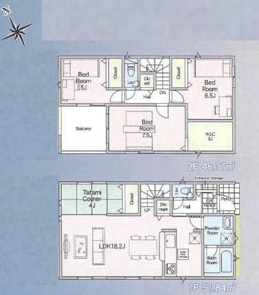 | 間取 | 3LDK + WIC、畳コーナー4帖 (LDK18.2帖、洋室7.5帖、洋室6.5帖、洋室5帖) | ||
