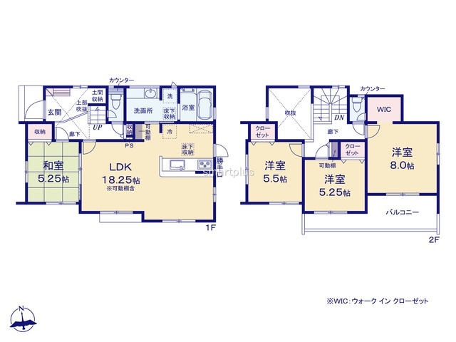 | 間取 | 4LDK + WIC、土間収納、 (LDK18.25帖、洋室8帖、洋室5.25帖、洋室5.25帖、和室5.25帖) | ||