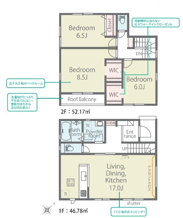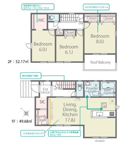 ~収納豊富なプランを採用~ ・ウォークインクローゼット、シューズインクロークなど収納豊富なプランを採用。 ・今のお住まいと収納力をぜひ比較してみてください。 (1号棟)