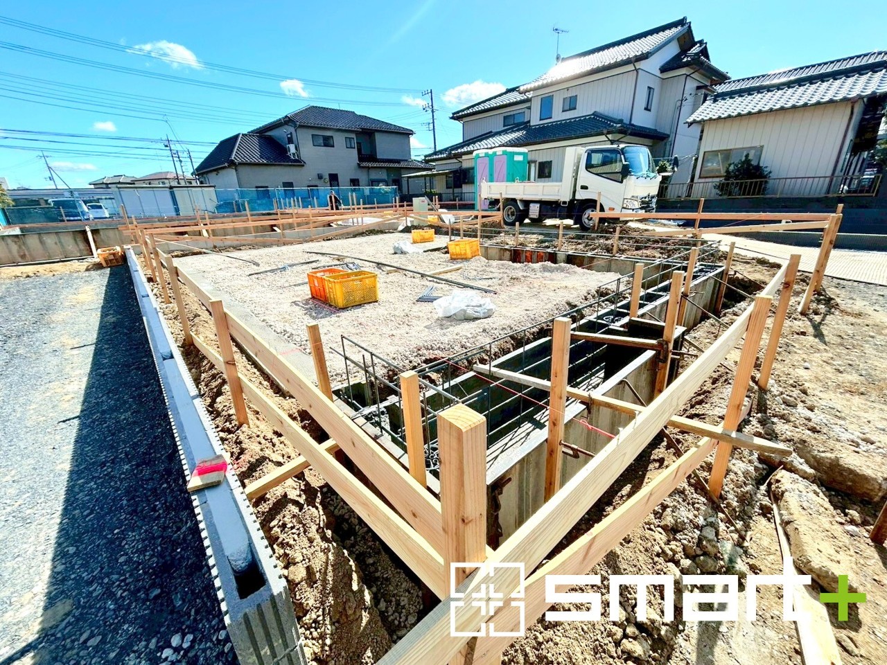 ~ベタ基礎でしっかりとした土台~ ・コンクリートの中に鉄筋を配し強度を高めた「ベタ基礎」を採用。 ・しっかりとした土台を造ったうえで、その上に建物が築造されていきます。 (1号棟)