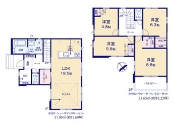 | 間取 | 4LDK + WIC×2、SIC、ファミリークリーク (LDK18.5帖、洋室8.8帖、洋室6.3帖、洋室5.8帖、洋室4.8帖) | ||