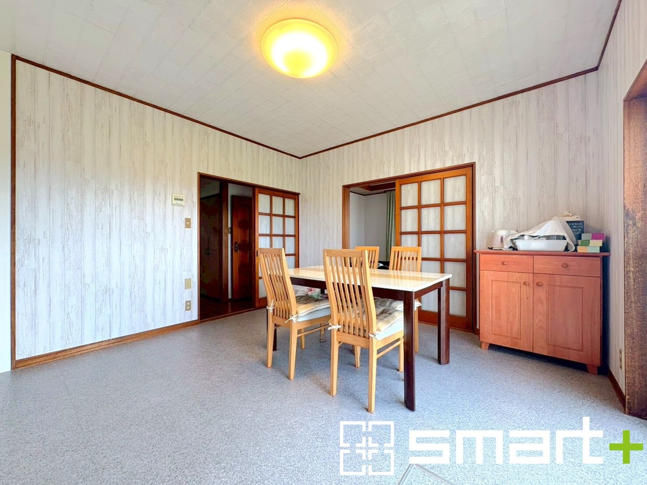 木目調の壁紙が温かみと落ち着きをもたらす空間。広々とした食卓を囲めば、家族の笑顔が集まる穏やかなひとときが生まれます。キッチンと繋がる心地よい動線も魅力です