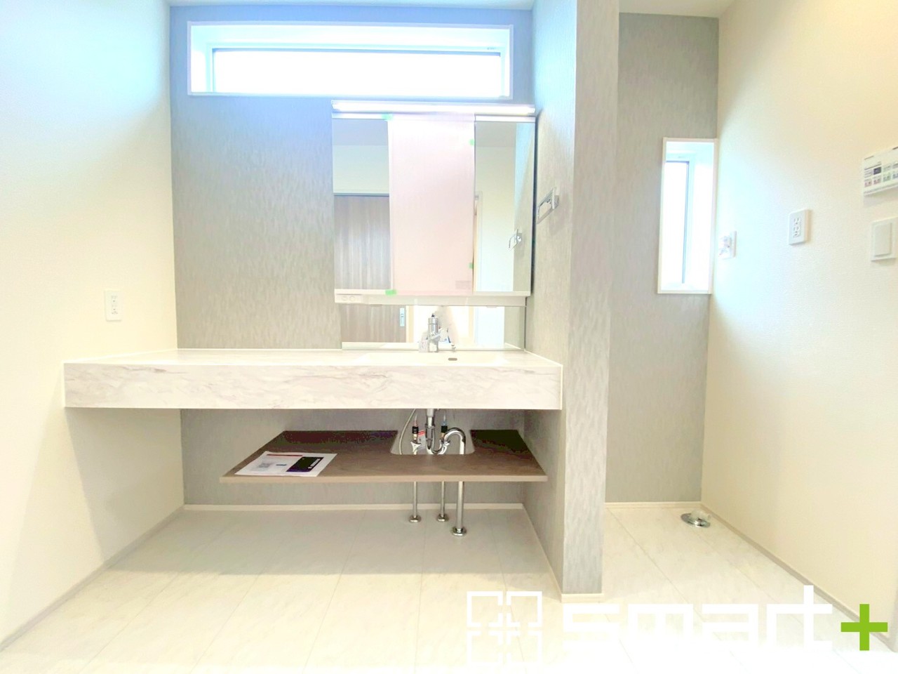 ~スタイリッシュな洗面化粧台~ ・洗面ボウルとカウンターが一体になっているシームアンダーデザイン。毎日のお手入れも楽々ですね。 ・洗面台下のパイプスペースにも洗剤などをご収納可能です。