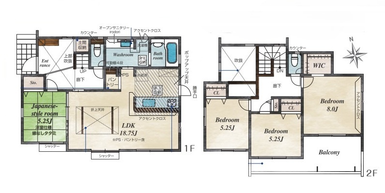 | 間取 | 4LDK + WIC、パントリー (LDK18.75帖、洋室8帖、洋室5.25帖、洋室5.25帖、和室5.25帖) | ||