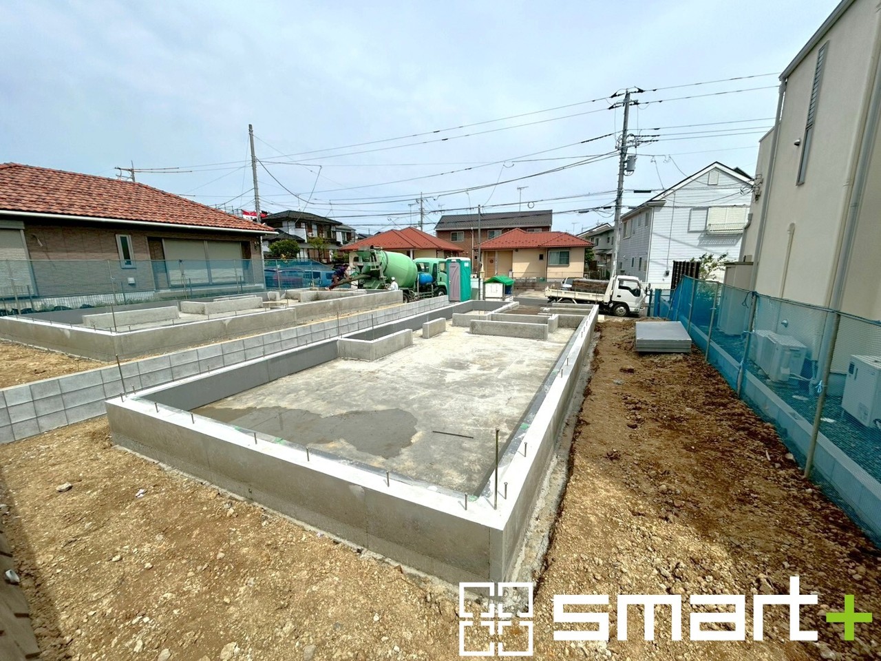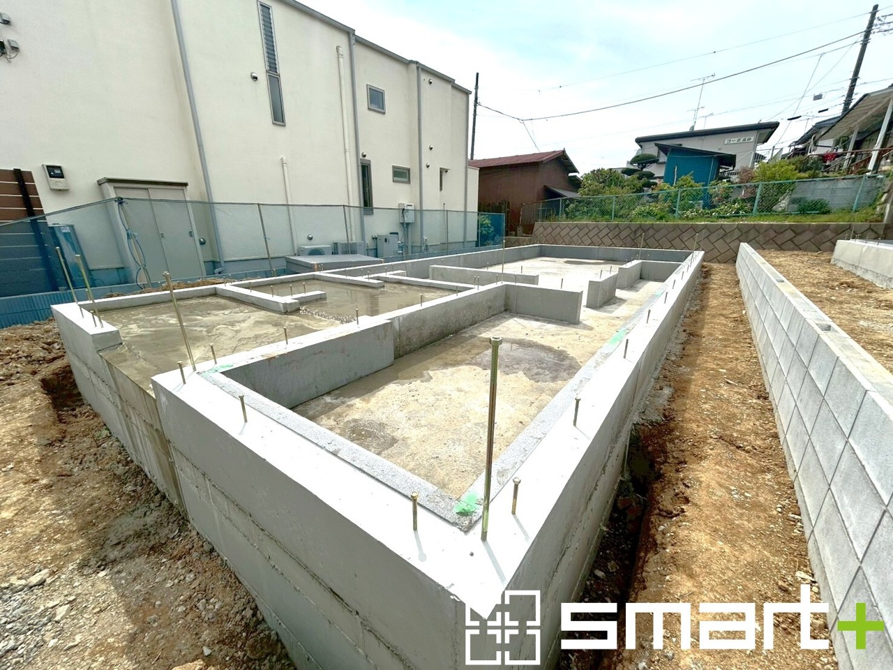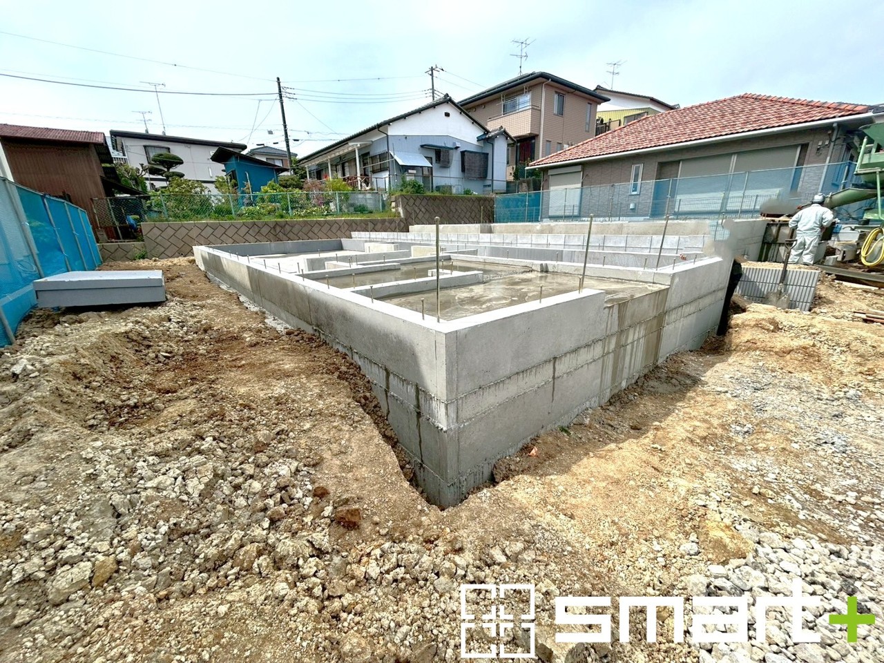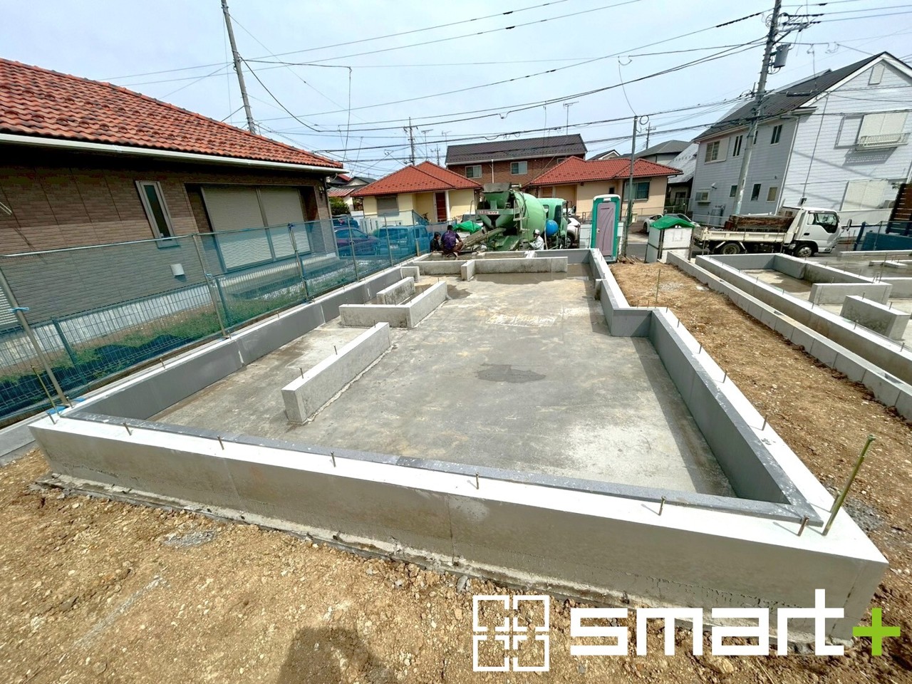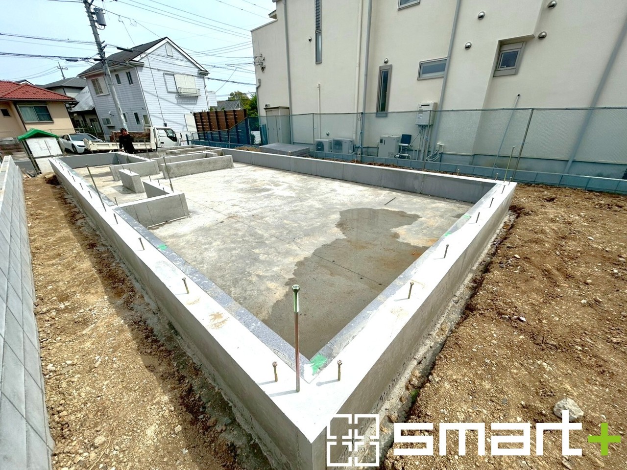 ~ベタ基礎でしっかりとした土台~ ・コンクリートの中に鉄筋を配し強度を高めた「ベタ基礎」を採用。 ・しっかりとした土台を造ったうえで、その上に建物が築造されていきます。 (1号棟)