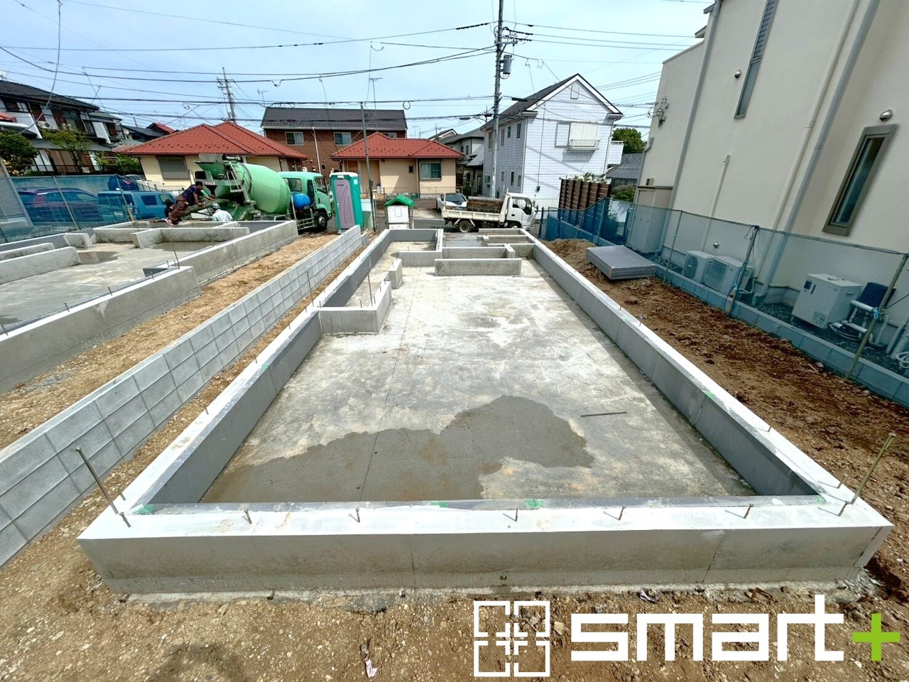 1号棟 ~ベタ基礎でしっかりとした土台~ ・コンクリートの中に鉄筋を配し強度を高めた「ベタ基礎」を採用。 ・しっかりとした土台を造ったうえで、その上に建物が築造されていきます。