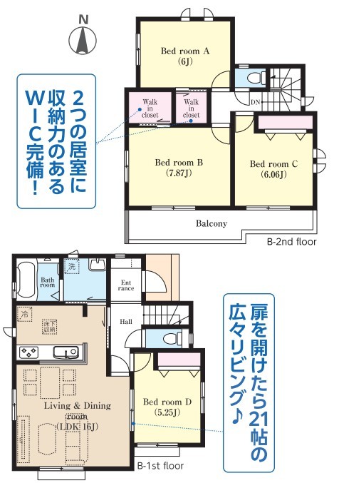 B号棟 ~開放感ある角地のお住まい~ ・2方向が空く事で開放感のある角地に位置しております。 ・窮屈な感じが無く、ゆったりと暮らせるこの魅力をぜひ現地でご体感くださいませ。