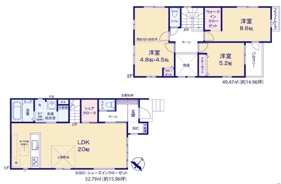 | 間取 | 3LDK + WIC、FC、4LDK対応可 (LDK20帖、洋室9.3帖、洋室8.6帖、洋室5.2帖) | ||