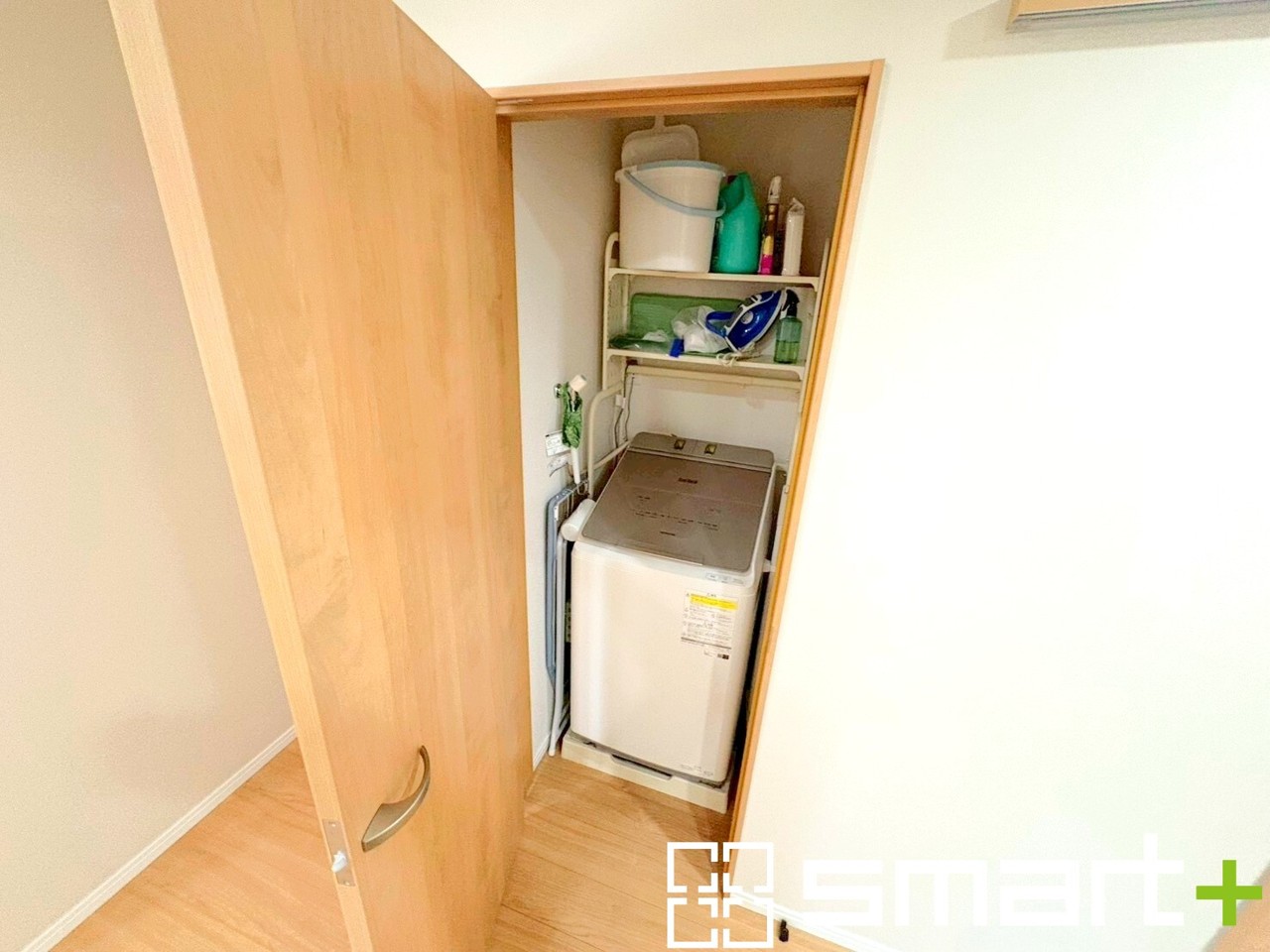 扉を開けると、生活感をスマートに隠せる洗濯機置き場。棚には洗剤類を整頓して置け、住まいの快適さをさりげなく支えます。木目の扉が、空間に温かみと落ち着きをもたらしています