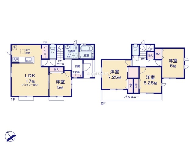 | 間取 | 4LDK + WIC、パントリー (LDK17帖、洋室7.25帖、洋室6帖、洋室5.25帖、洋室5帖) | ||